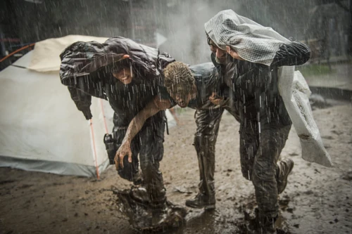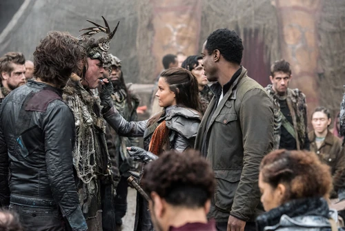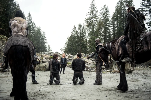 Essi camminano attraverso lo stesso campo in cui Roan e Clarke hanno camminato. Indra chiede a tutti di fare silenzio quando sentono tamburi di guerra provenienti da una certa distanza. Indra li riconosce come Azgeda dai tre scout morti nel campo. Pike dice a tutti che devono spostare i corpi dal campo prima dell'arrivo dell'esercito o verranno incolpati per questo. Bellamy vede Roan e Clarke sull'altro lato del campo proprio quando Kane vede l'esercito entrante avanzare da un'altra estremità del campo, separandoli da Clarke. Monty vede una caverna e dice di usarla come nascondiglio fino al passaggio dell'esercito e Indra va ad avvertire il comandante perché la nazione del ghiaccio ha appena marciato in terre Trikru. Indra avverte Kane che se la regina di ghiaccio trova Clarke, lei morirà e loro saranno tutti in guerra.