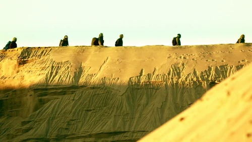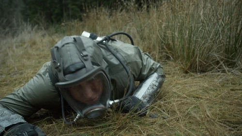 Carl Emerson is frantically trying to get back to Mount Weather before the oxygen in his tank runs out. He gets to the top of a hill and collapses as his oxygen runs out. Booted feet appear before him and Cage Wallace switches out his oxygen tank. Cage isn't wearing any protection because the |bone marrow treatments work and he tells Emerson, "the ground is ours."