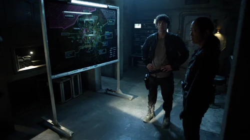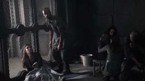 A little later, Pike is talking to Hannah, Bellamy, and Monty. Hannah explains that, with the blockade still intact, their supplies will last for approximately two weeks, if they start rationing them. She also suggests fighting the blockade. Pike refuses this, wanting to take down the enemies within Arkadia first. He tells Monty to change the camps access codes every day. He also insists on spying on the Sky People, shocking Monty at first, Pike explains that his commands cannot be leaked to Kane anymore.