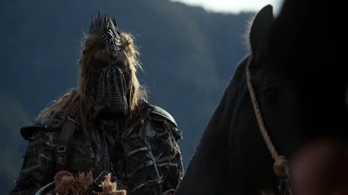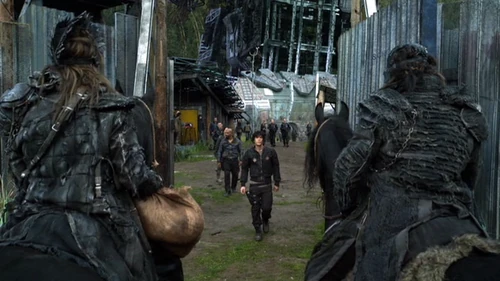 Hannah is explaining the dimensions of the blockade to Bellamy and Pike when suddenly, two Grounders appear in front of Arkadia. Bellamy goes to the messengers, who explain their conditions of the blockade: the Sky People either give Pike to the twelfth Clan, or the blockade stays and every member of Skaikru that is seen outside Arkadia dies. In order to make the threat clear, one of the Grounders throws the bloodied uniforms of the Arkadia guards that were on watch in front of Bellamy's feet. Pike orders Bellamy to step back. He does, but not before shooting the messengers.