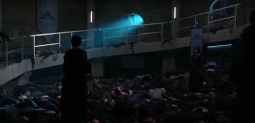 The show begins with a shot of the different clans running around in chaos. A young boy, Ethan, is looking around for his dad, Hardy, but can't find him. Moments later, we see John Murphy running around asking about Emori. He asks Niylah, but she hasn't seen her. He eventually finds Emori. She tells him that there are only 100 beds for Arkadians in the Second Dawn bunker. Ethan eventually finds his father, Hardy, as well. Afterward, an angry mob of people crowd into the bunker. At this moment, we see Thelonious Jaha talking to Bellamy and Clarke in despair. Tensions are clearly going beyond the boiling point.